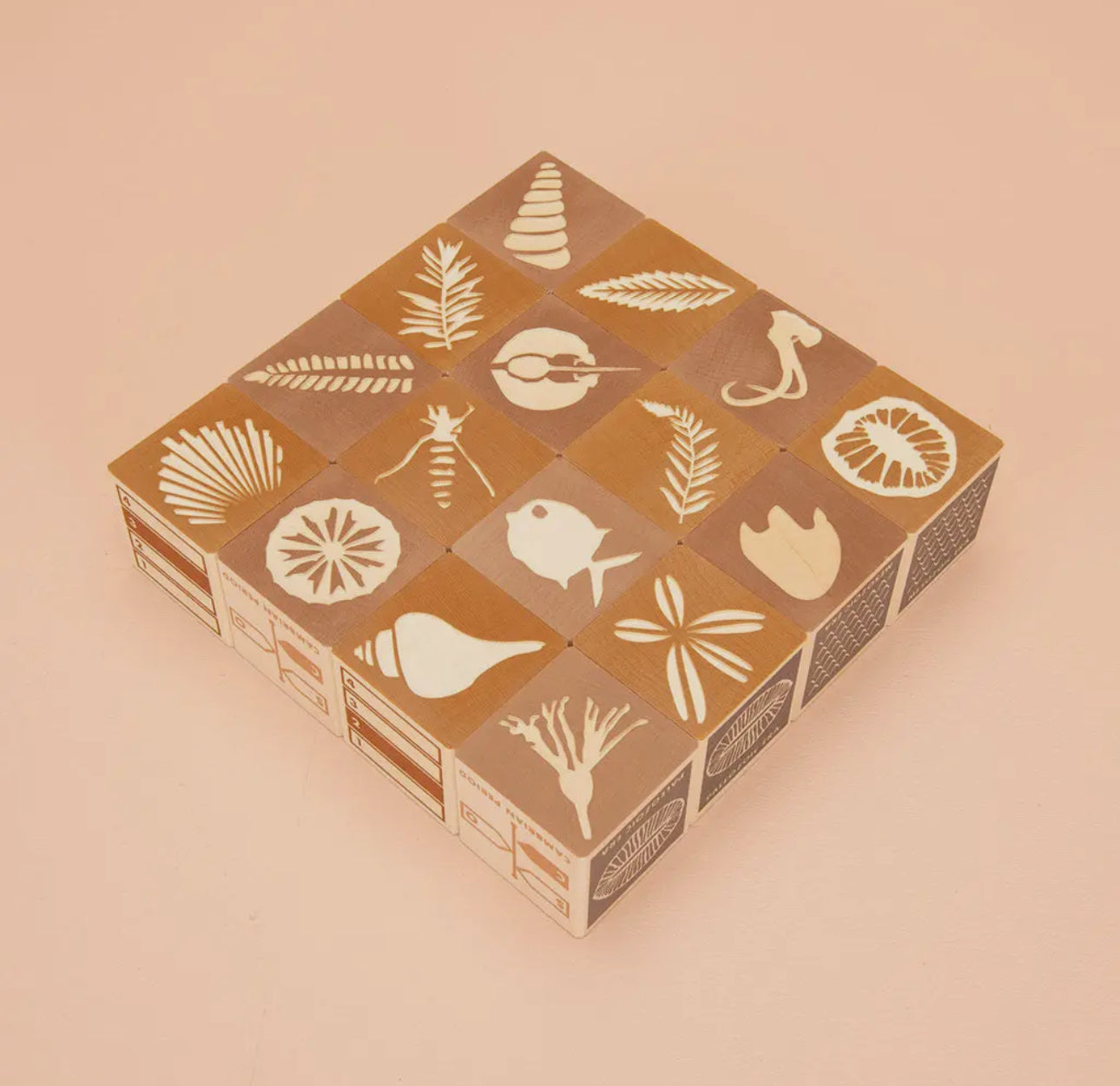 See and feel 16 earth tone fossils. Enjoy the slate blue era and geography accents. Two debossed sides show fossil illustrations. Four printed sides feature the fossil place, time period, era, and rock layer.