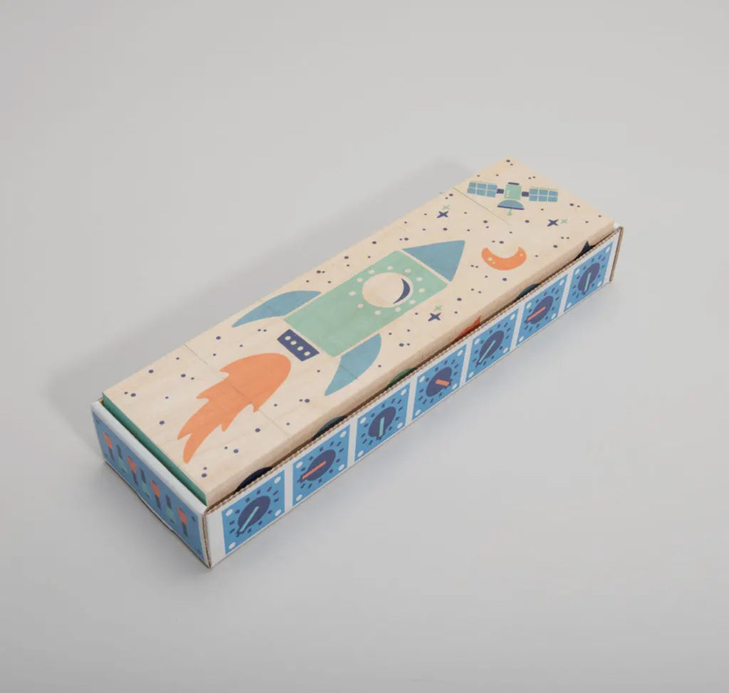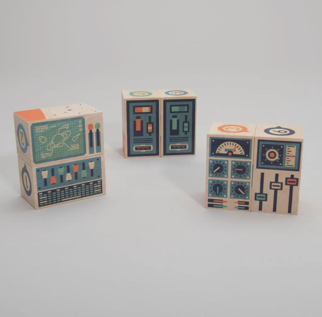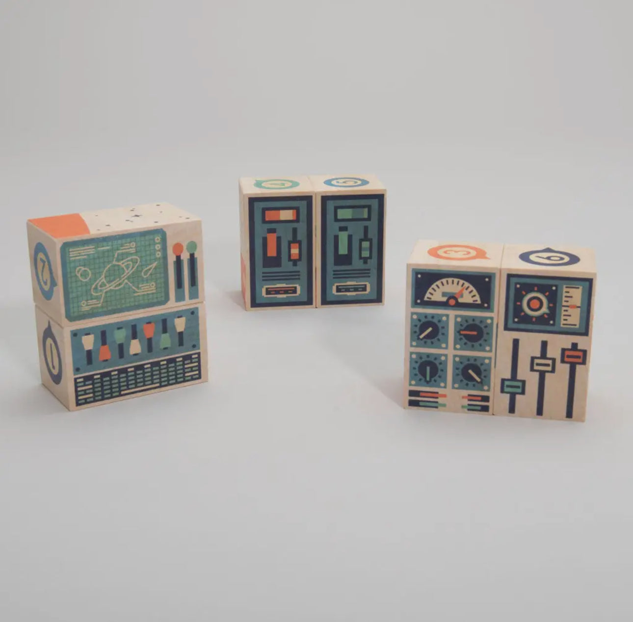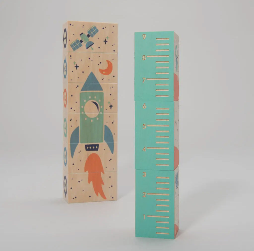 Countdown 6 to takeoff! You’re going to outer space. Build your rocket ship and zoom through the sky. Study your control panel. Land on another planet. What will you see as you explore other worlds? More than colorful blocks, this artful set is a decorative puzzle with a ruler.