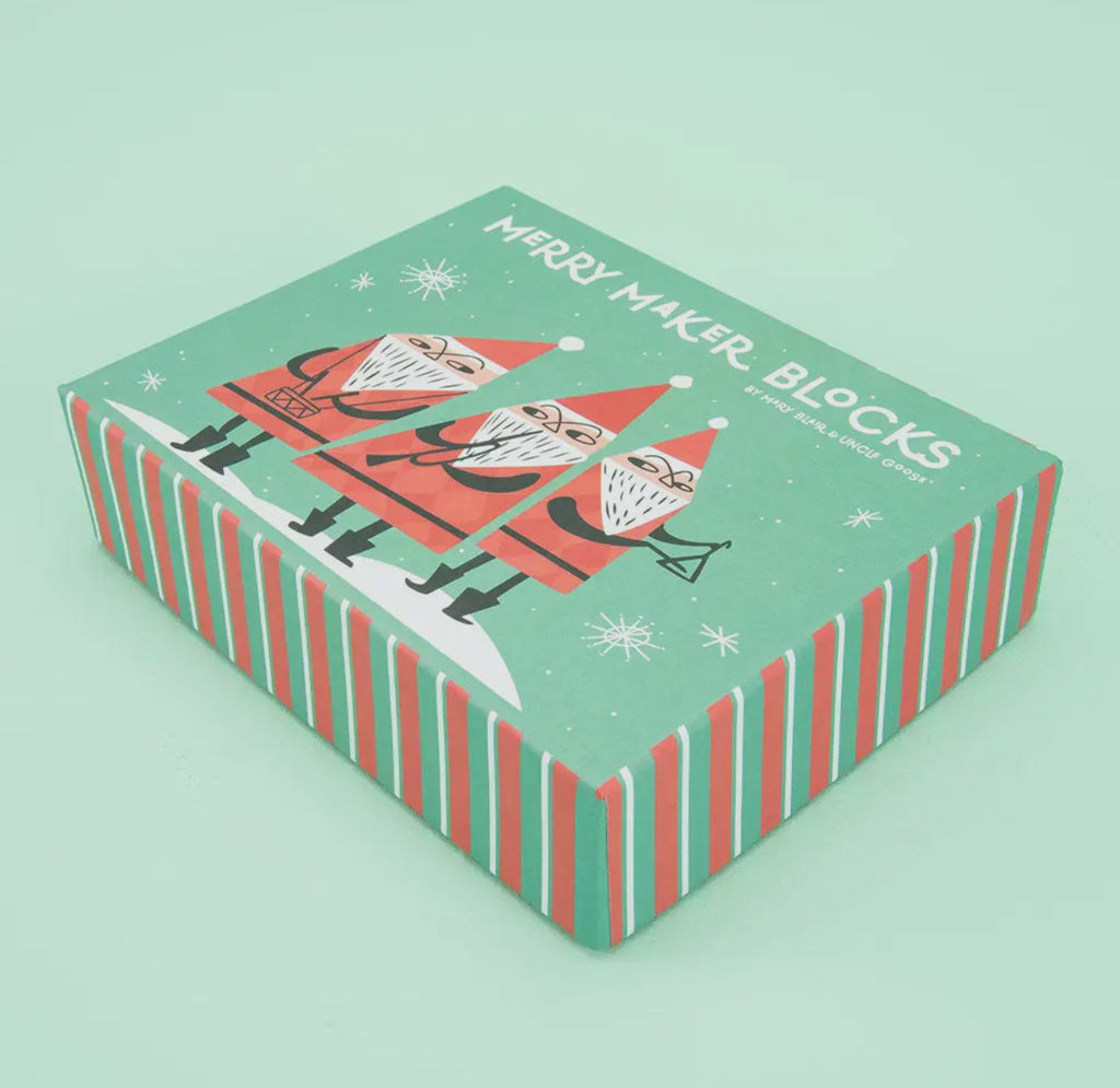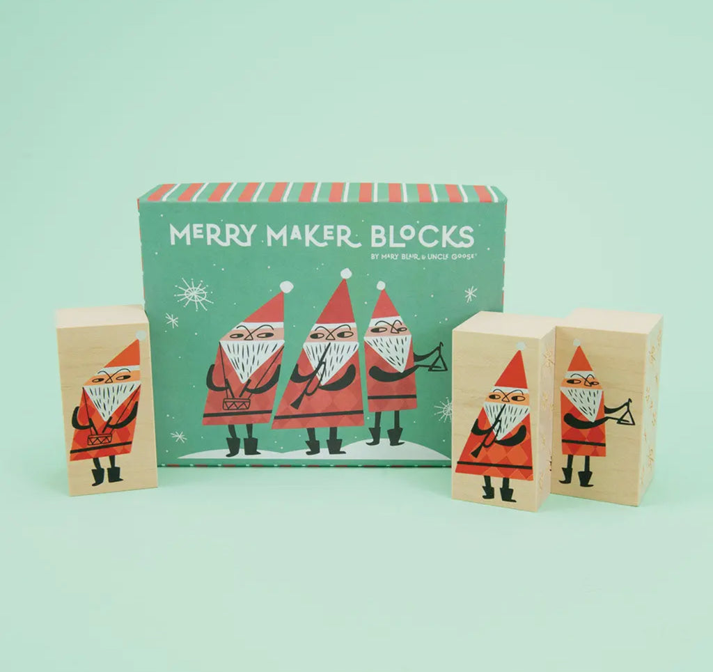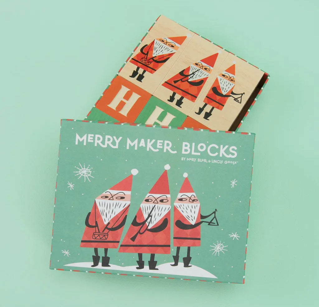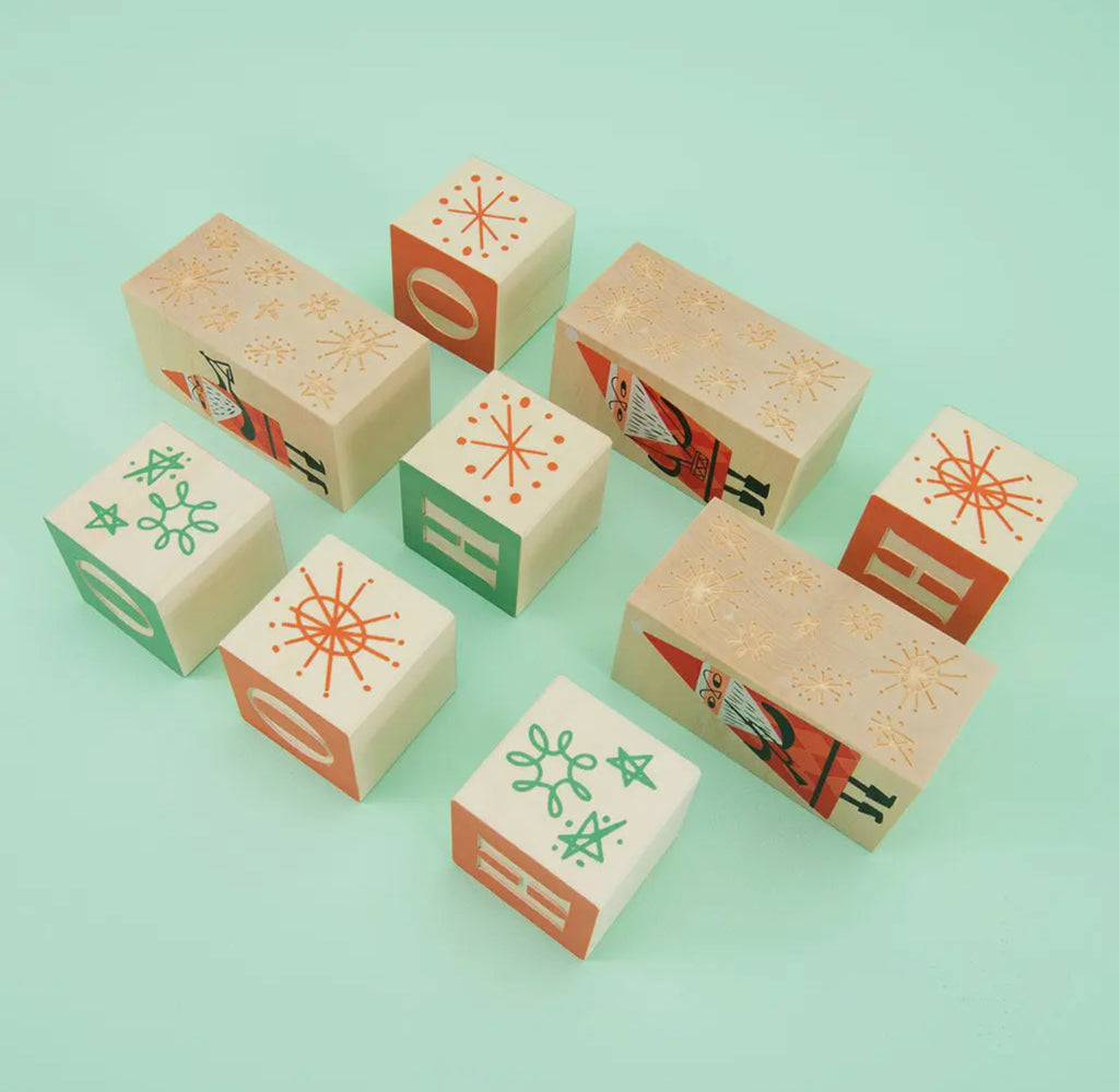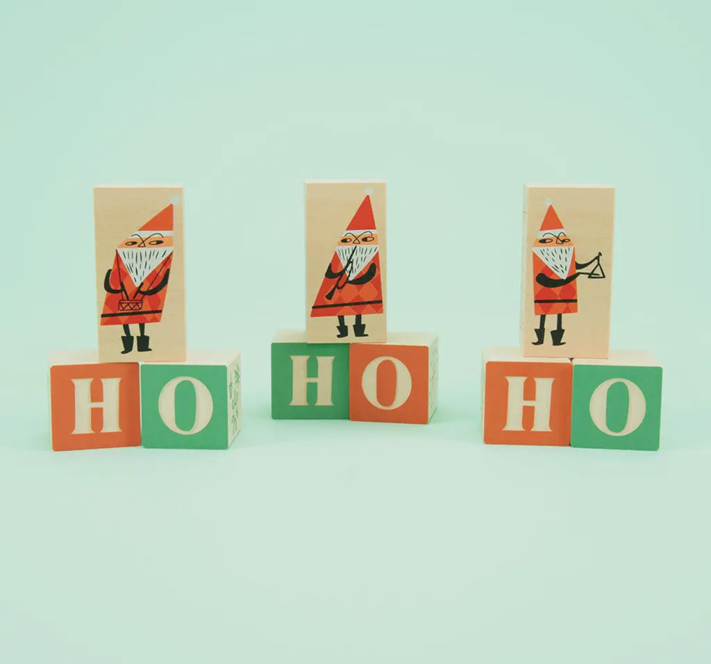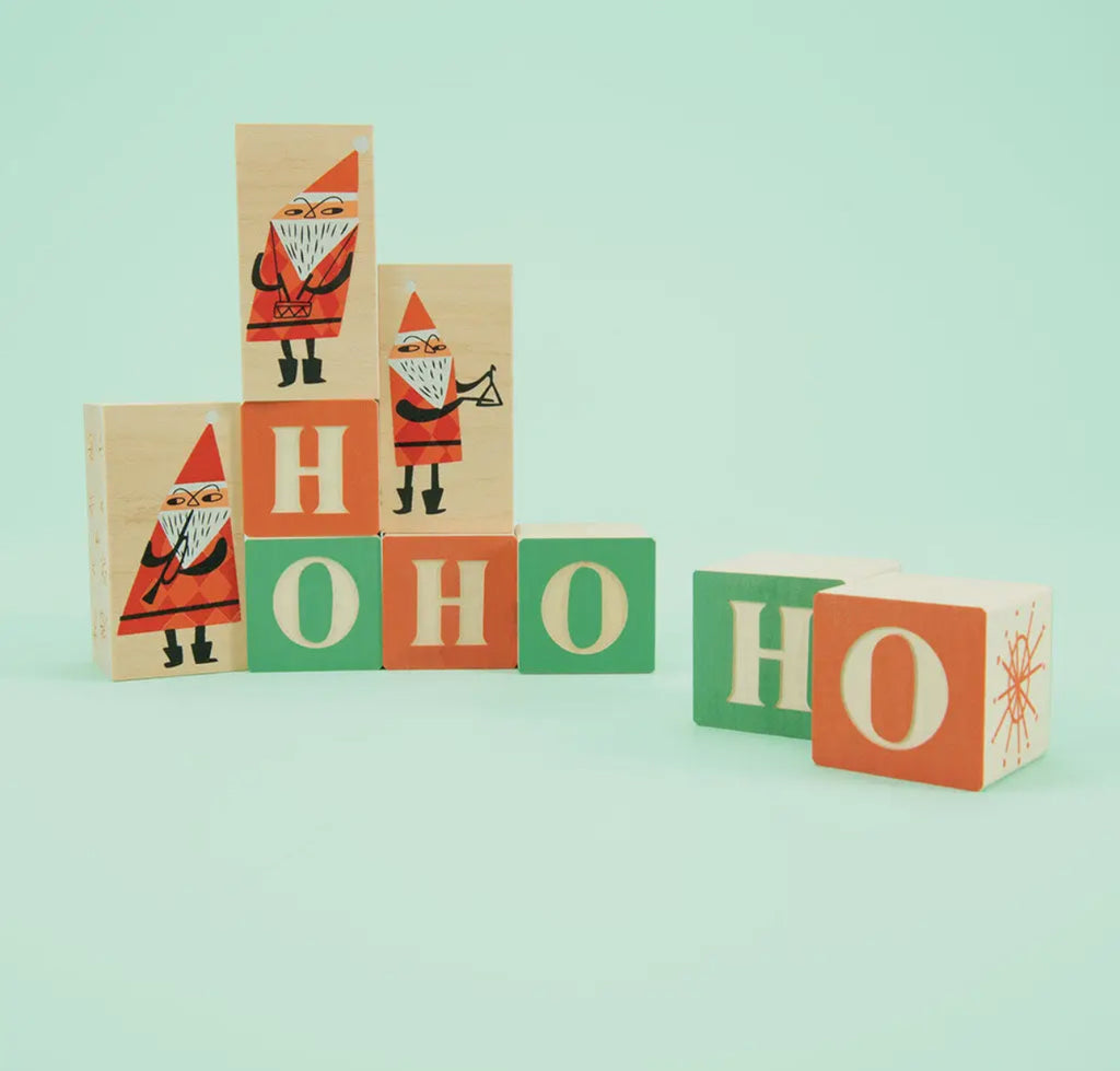 Three tall blocks feature a Mary Blair Santa illustration. In one, you'll see Santa playing a drum. In another, you'll see him playing a triangle. The third Santa blows his own horn. Enjoy the debossed snowflake and star designs on opposing sides of each Santa block. You can spell "Ho, Ho, Ho" with six red and green debossed blocks featuring hand-printed illustrations on opposite sides.