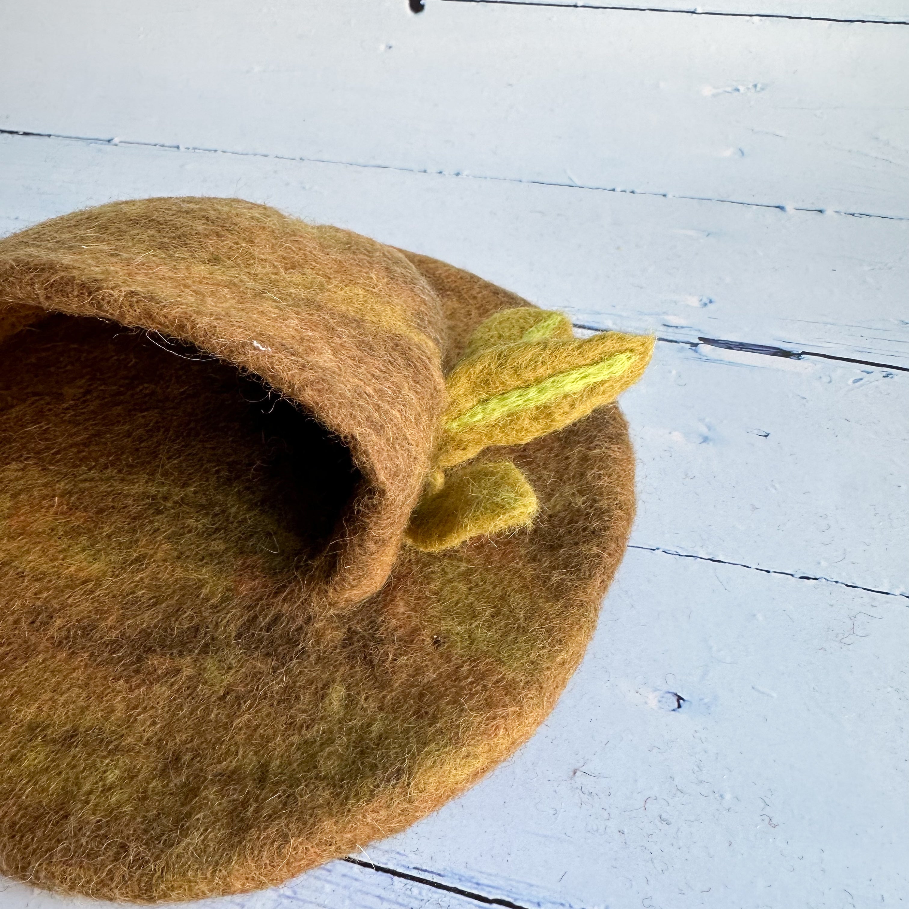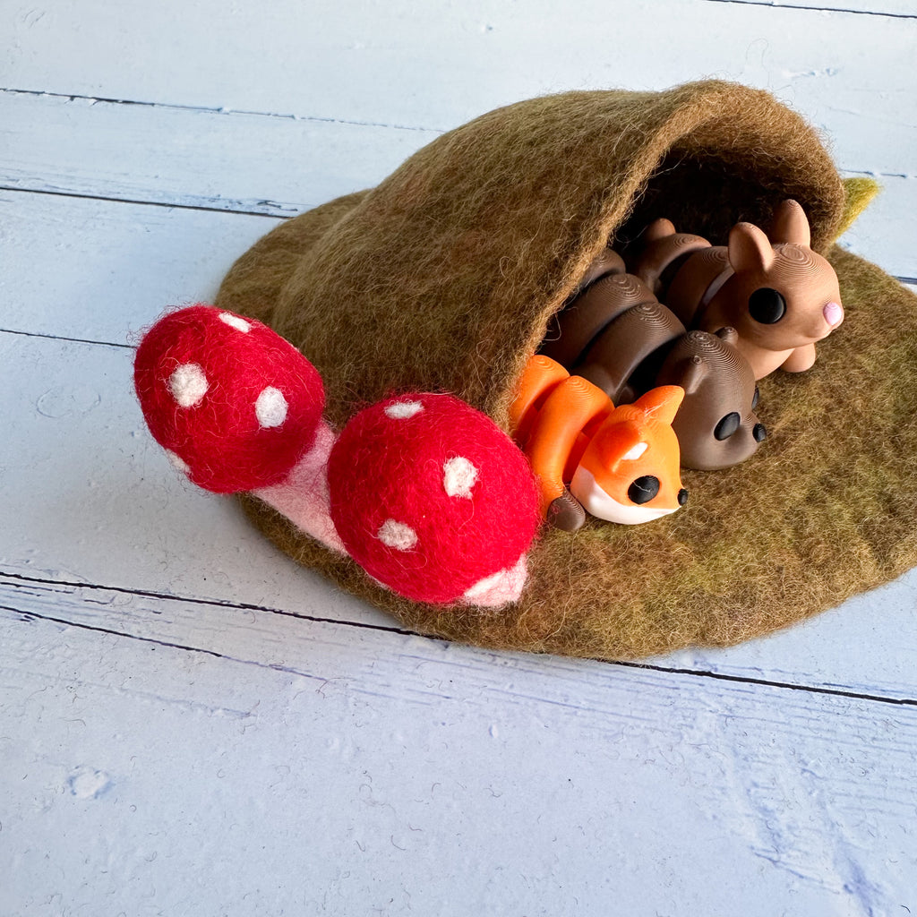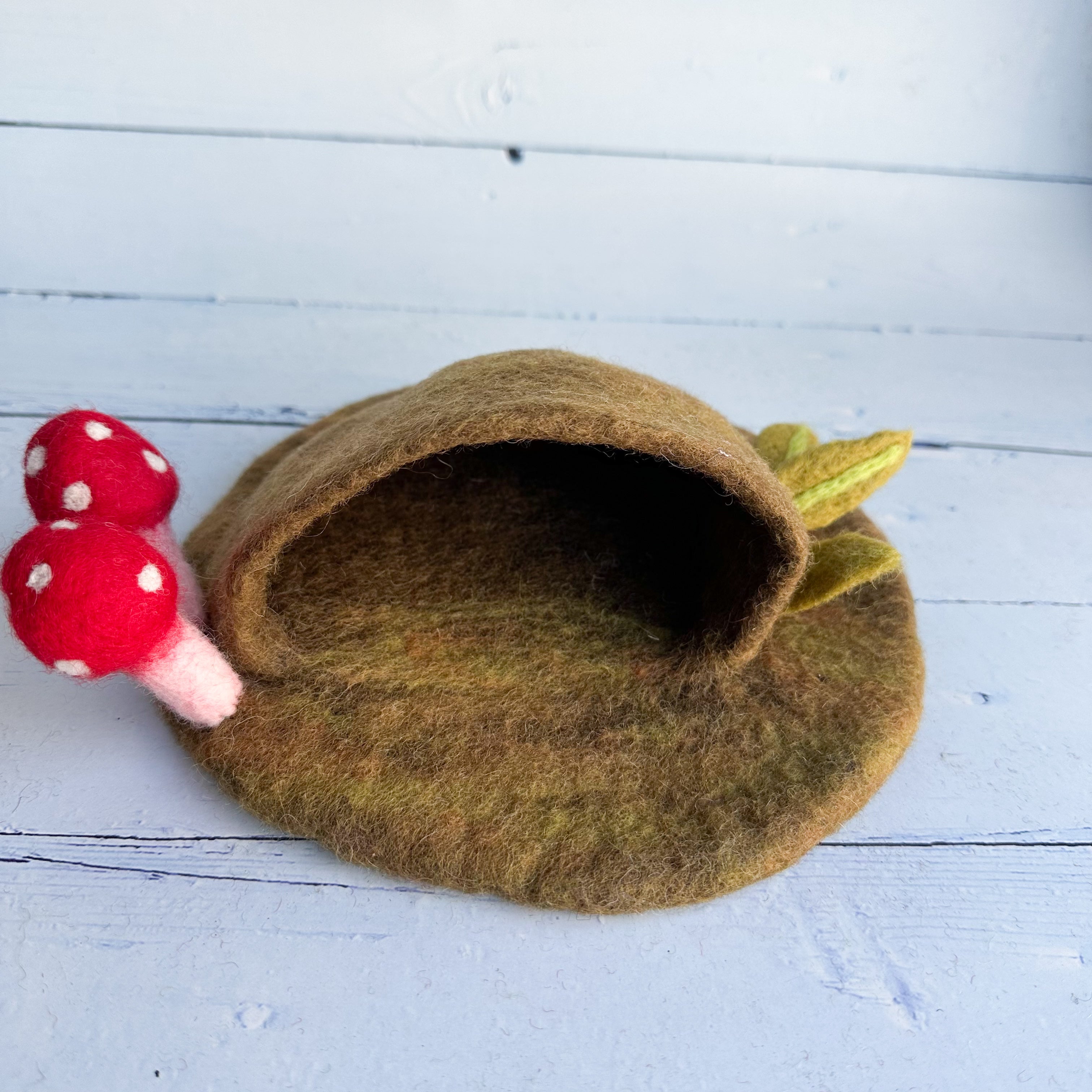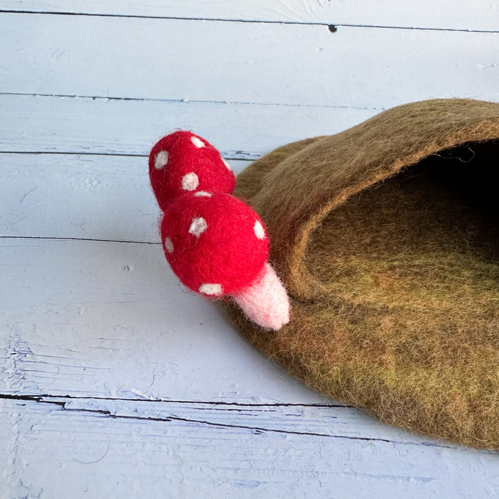Create a magical woodland hideaway for imaginative small-world play with this hand-felted wool cave. Designed with earthy brown tones, a soft round base, and whimsical details like red-spotted toadstools and leafy greens, this cozy cave invites hours of storytelling and open-ended play.
